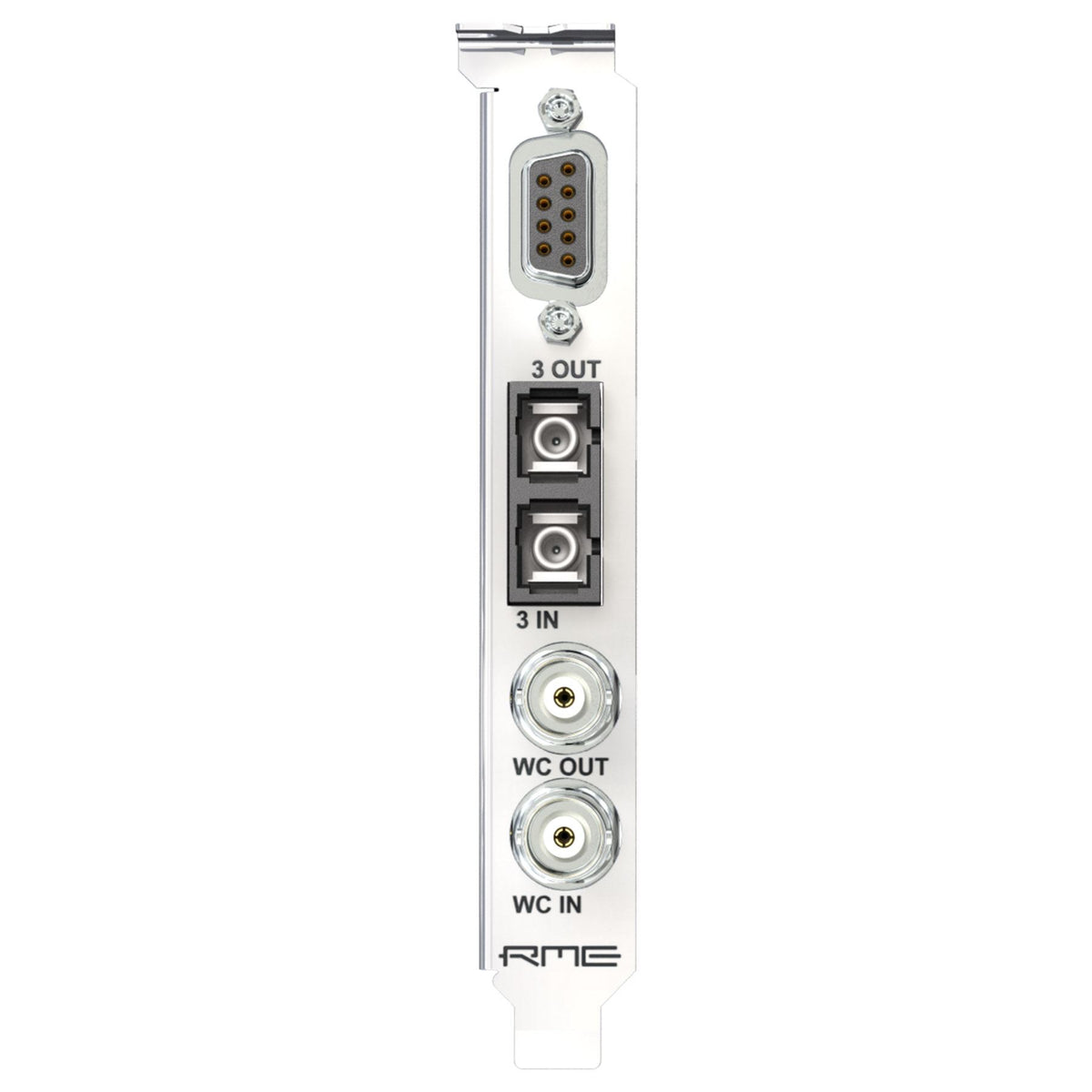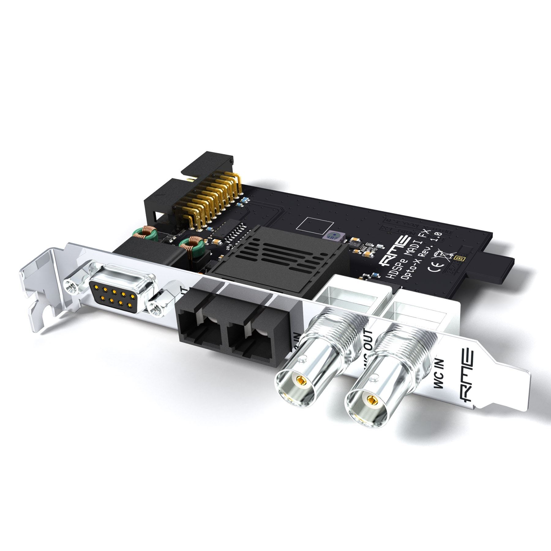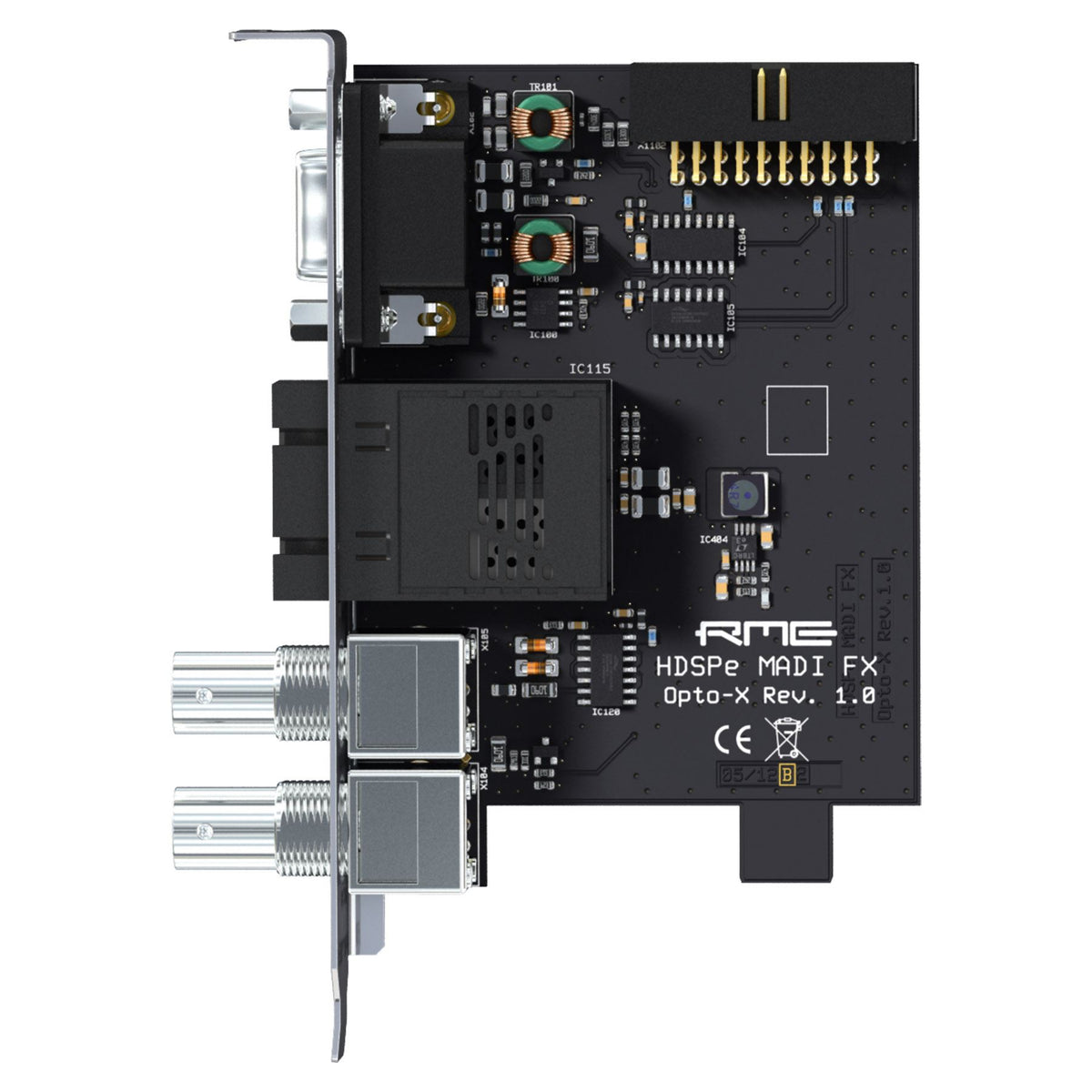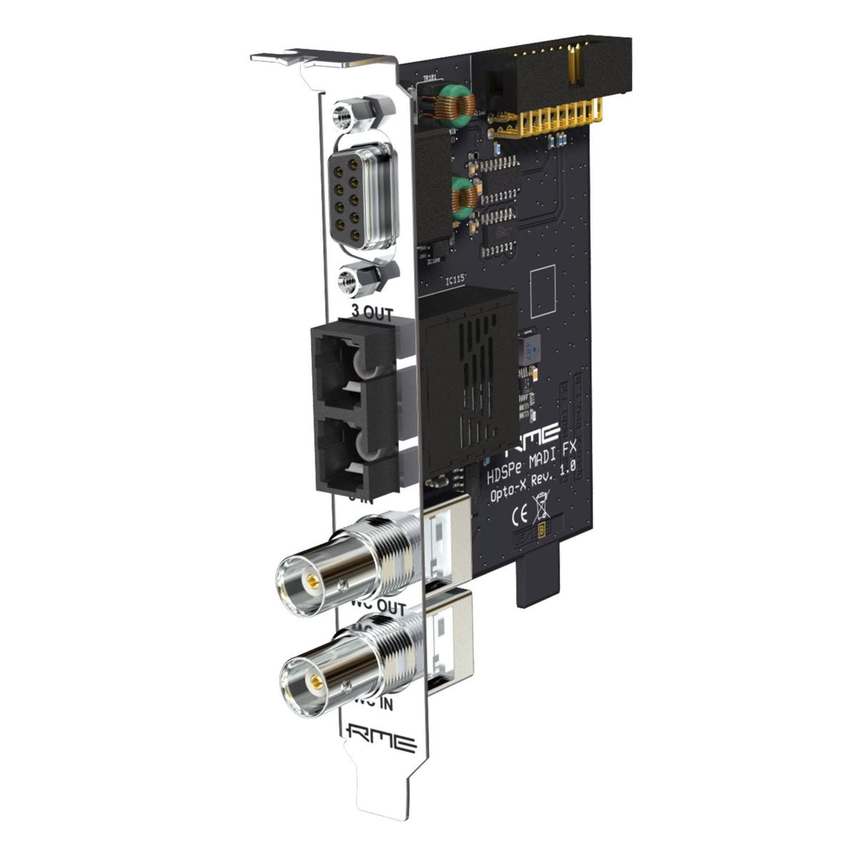 The OPTO-X is an alternative extension board for the HDSPe MADI FX triple MADI card with full functionality. Like the standard extension board it comes with Word Clock I/O and a D-sub connector for MIDI and AES I/O. The standard coaxial MADI I/O is replaced by an optical MADI I/O. Using the OPTO-X the HDSPe MADI FX then has three optical MADI I/Os