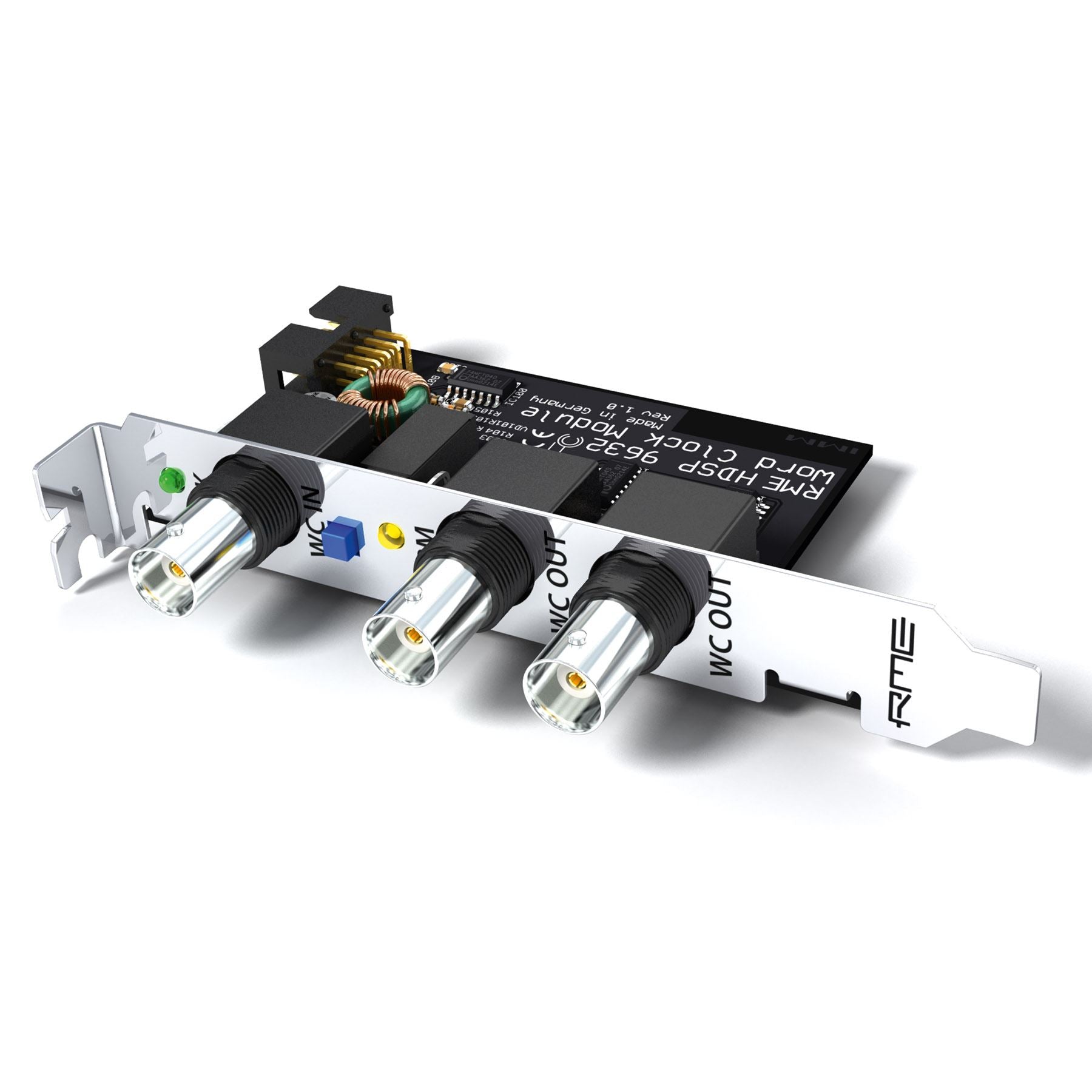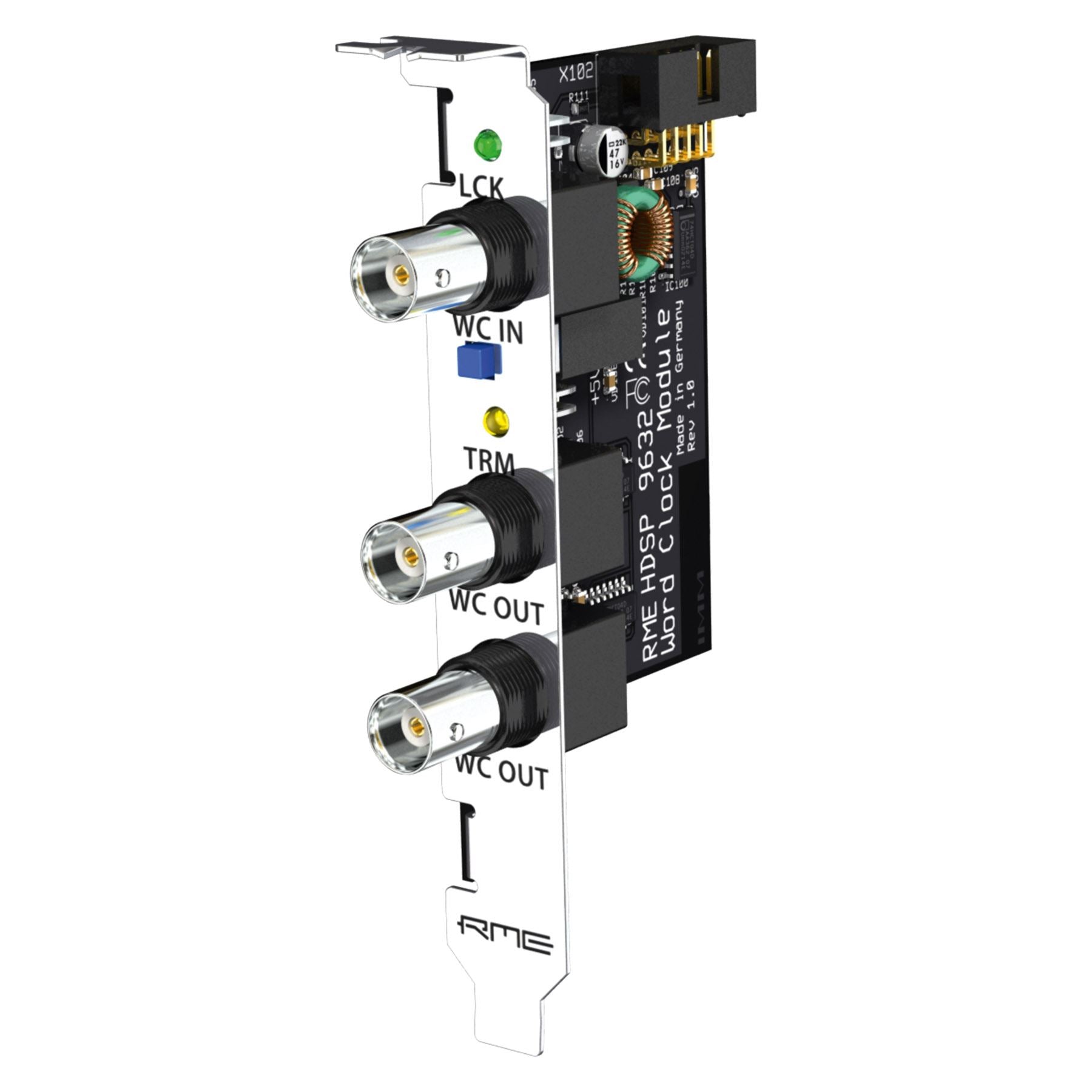 The Word Clock Module (WCM) provides a galvanically isolated word clock input and two word clock outputs (BNC connectors). Both outputs have their own driver stages, providing an extremely low jitter signal. A push switch activates 75 Ohms termination for the hi-impedance input. SteadyClock, part of the PCI card, guarantees an excellent performance in all clock modes. Its highly efficient jitter suppression refreshes and cleans up any clock signal, and provides it as reference clock at the two outputs.