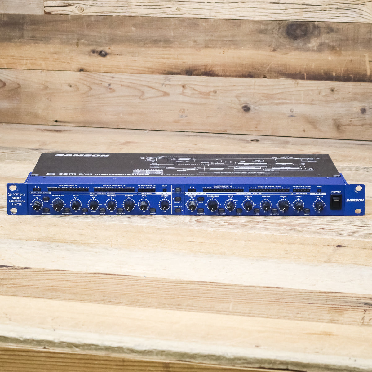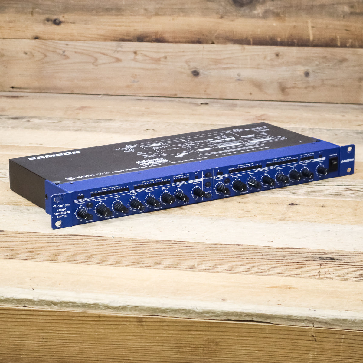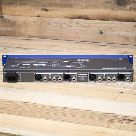 The S com plus is a highly adaptable stereo compressor/limiter in an efficient single rackspace design. It is intended for situations where extra flexibility is required to optimize signal levels. It delivers essential control along with simplicity of operation. S com plus's comprehensive and wide-ranging controls provide extensive manipulation of audio dynamics, even in the most complex situations. Each channel features a wide range of variable control. A feature-rich Compressor section includes variable Threshold, Ratio, Attack and Release controls. Samson's SKD (Smart Knee Detector) circuit dynamically adjusts the compression curve to ensure a musical result. Our exclusive AEG (Auto Envelope Generator) function simplifies optimum settings by constantly analyzing the audio input and automatically adjusting the attack and release parameters based on the changing level. Key Inputs and Outputs are included for externally processing the control voltage. The Expander/Gate features a variable threshold level and switchable release time (fast or slow). The Gate switch changes the downward expander ratio from "light" to "hard" gating for control ranging from subtle to an obvious effect. A dedicated Peak/Limiter with variable control provides protection against peak and overload independently of the compressor. When used in combination with the Compressor the Peak/Limiter offers even more precise control over dynamic levels. A functional De-esser improves audio quality by removing "S" from vocals and sibilance from overly bright signal sources such as cymbals. The Enhancer switch engages the EFR (Enhanced Frequency Recovery) circuit, which restores high frequencies that are sometimes diminished by heavy compression. Extensive metering includes Input/Output, Gain Reduction, De-esser Level, Gate Open/Close and Limit. Other S com plus features