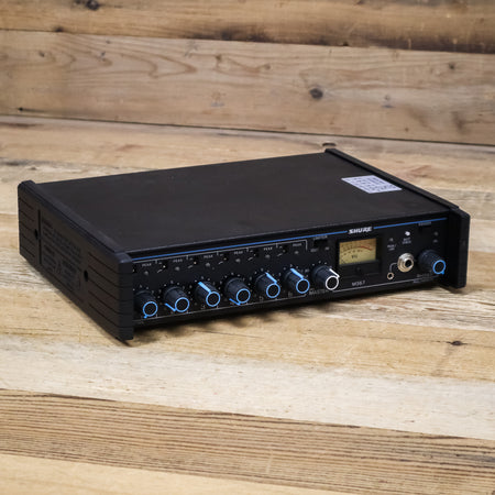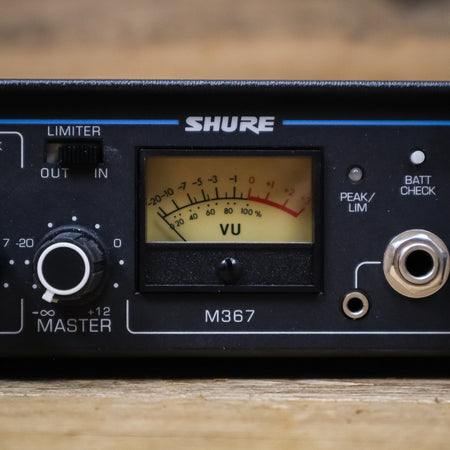 The Shure M367 field mixer provides all the features necessary for professional field mixing. The mixer features 6 high quality transformer-balanced XLR inputs and 2 XLR mono outputs (1 mic and 1 line). All input channels and one of the two outputs are switchable between Mic and Line level signal. The M367 is completely portable, capable of both AC and battery operation via two 9 volt alkaline batteries. A VU meter is provided for comprehensive metering of audio level and battery life. The M367 also features Low-Cut filter switches on all channels, a peak limiter switch and Phantom power on all 6 input channels. Additional features include a Mix Bus output for cascading to additional M367 or 267 mixers, 1kHz tone oscillator, and Headphone/Monitor (pull out) pot for monitoring signal on channel input or Monitor In jack.