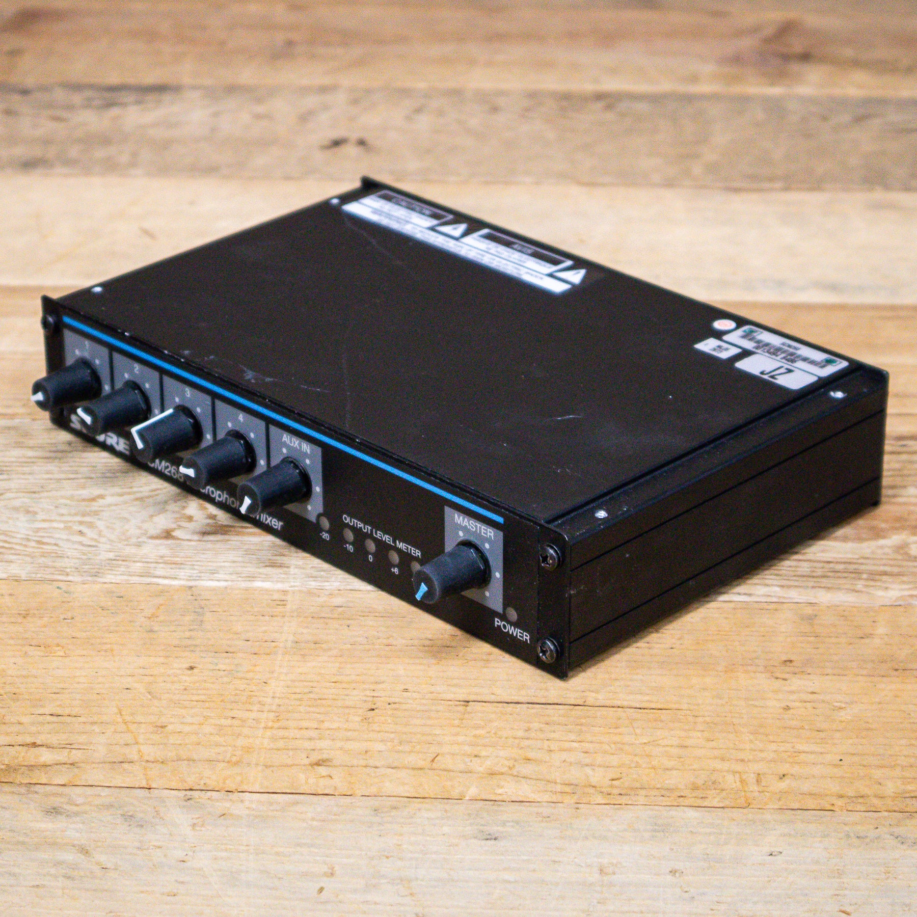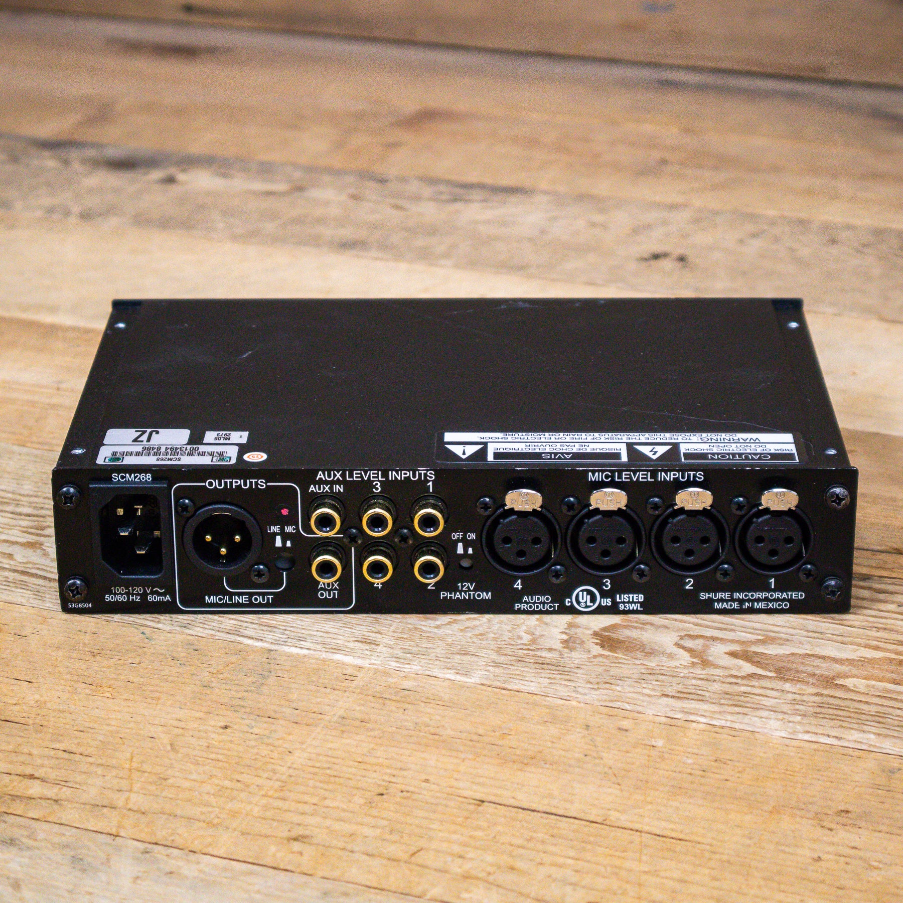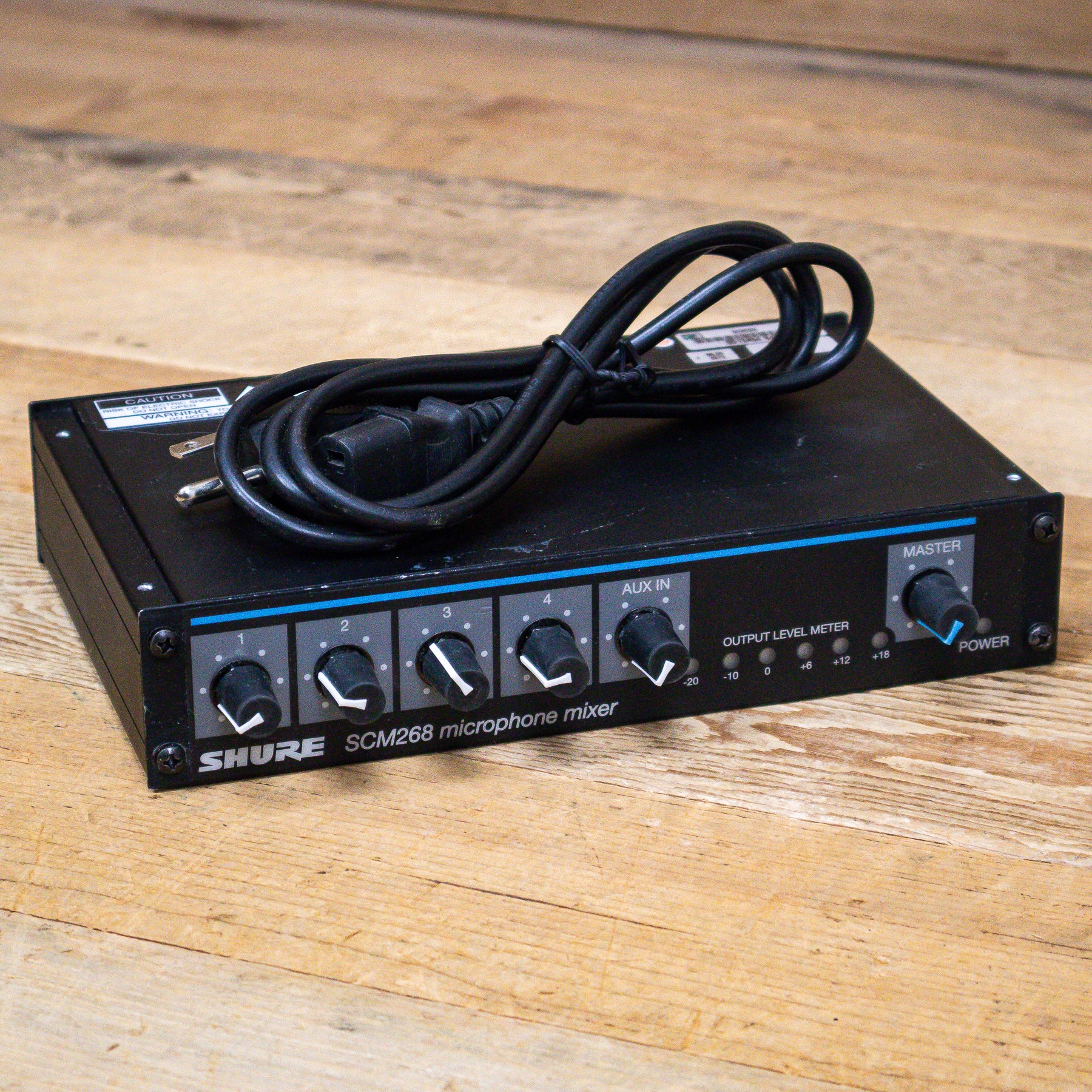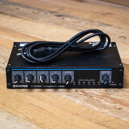 This used Shure SCM268 4-Channel Microphone Mixer comes with a Power Cable.