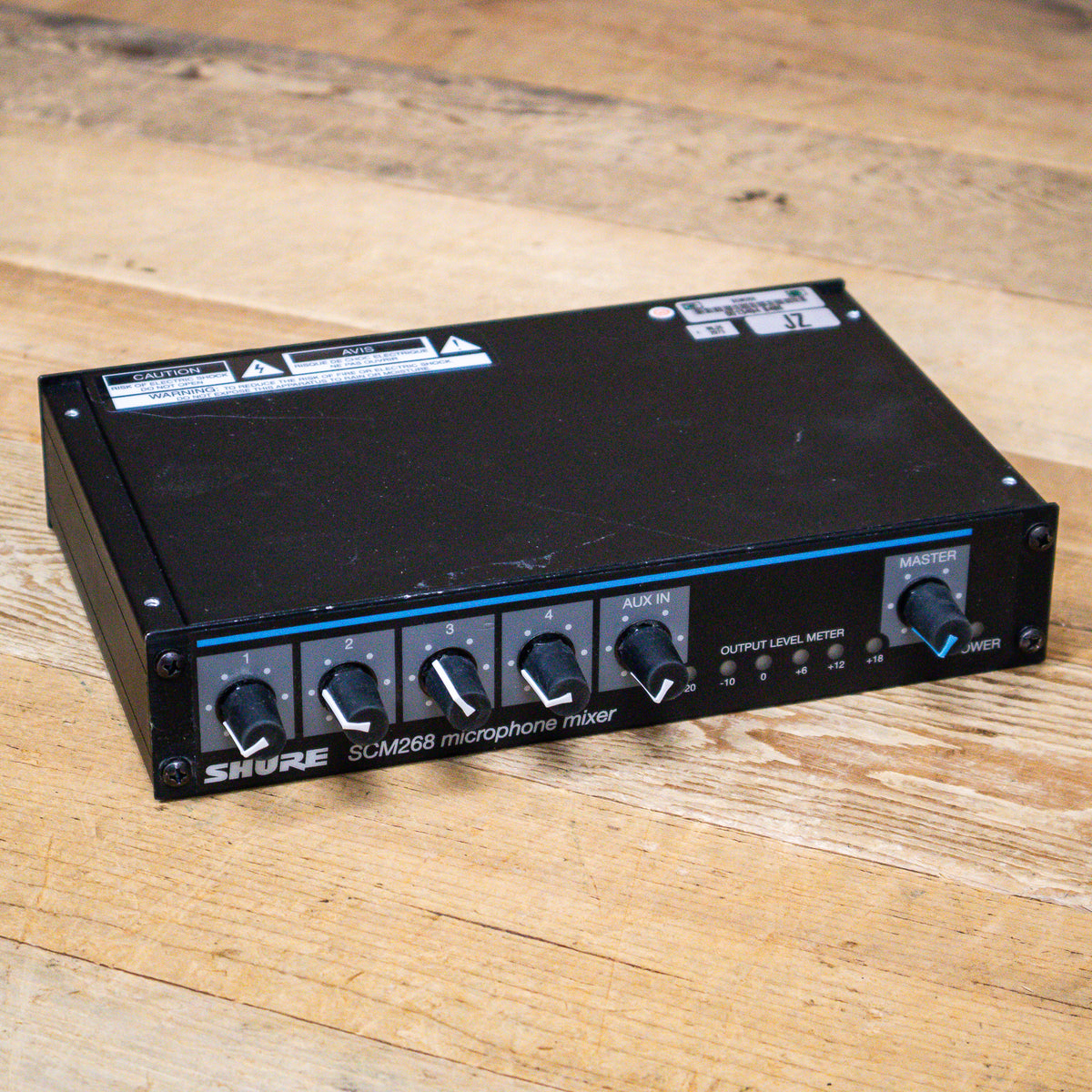 Six sealed rotary pots provide level control for mic channels 1 through 4, AUX input channel and Master. The SCM268 also provides 12V phantom power for condenser microphones.