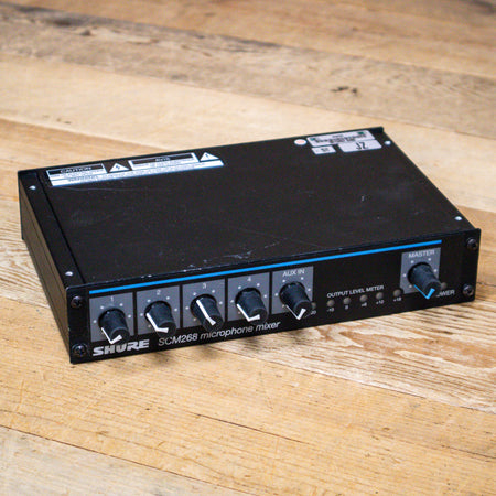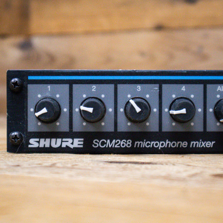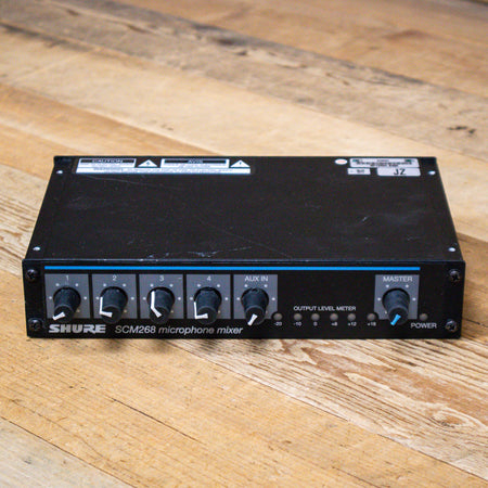 The Shure SCM268 4-Channel Microphone Mixer offers simplicity and routing flexibility in a convenient, compact, and rugged enclosure. The SCM268 features 4 high quality transformer-balanced XLR inputs and mic/line level switchable XLR output. Transformer balanced I/O provides maximum audio gain, minimizing hum and line noise.