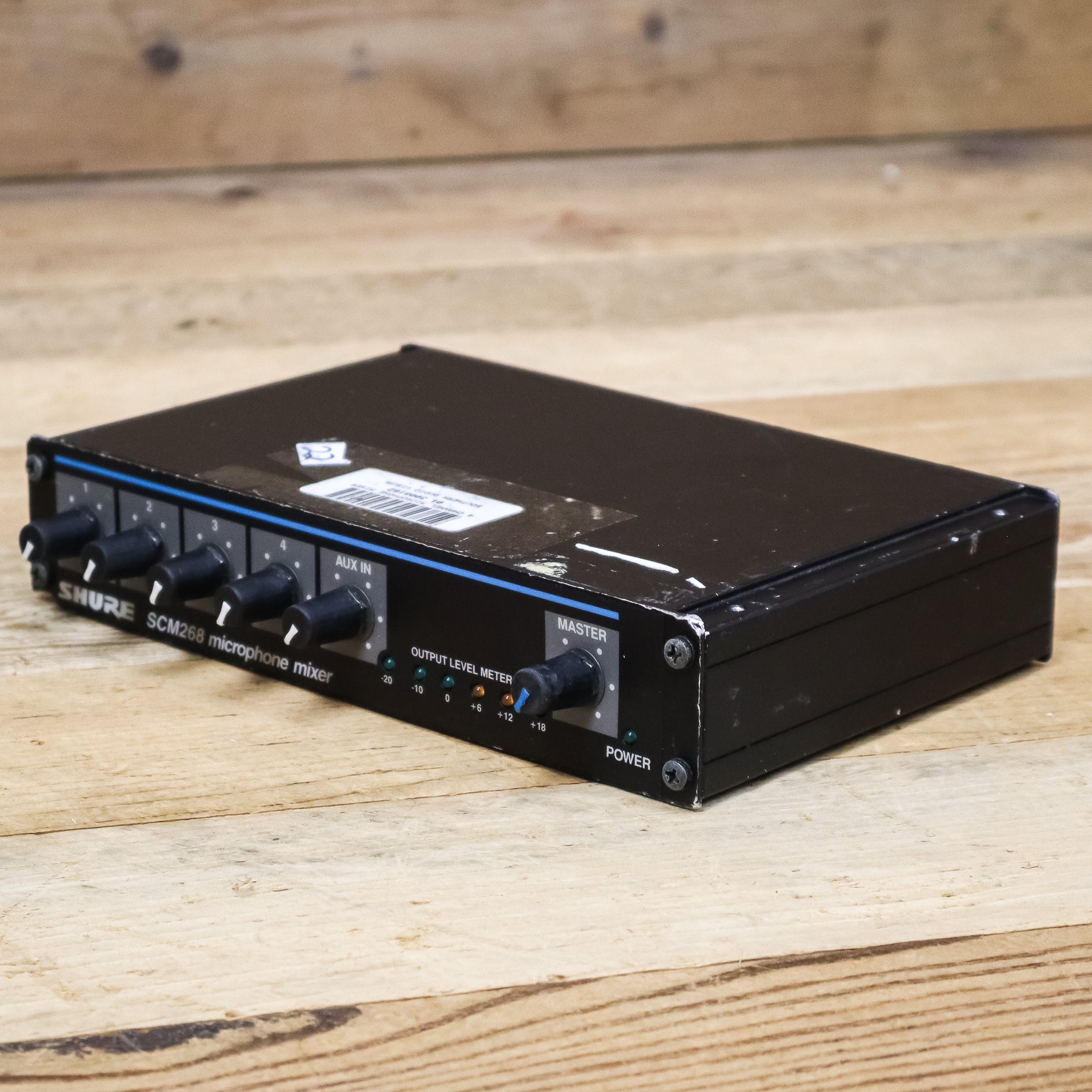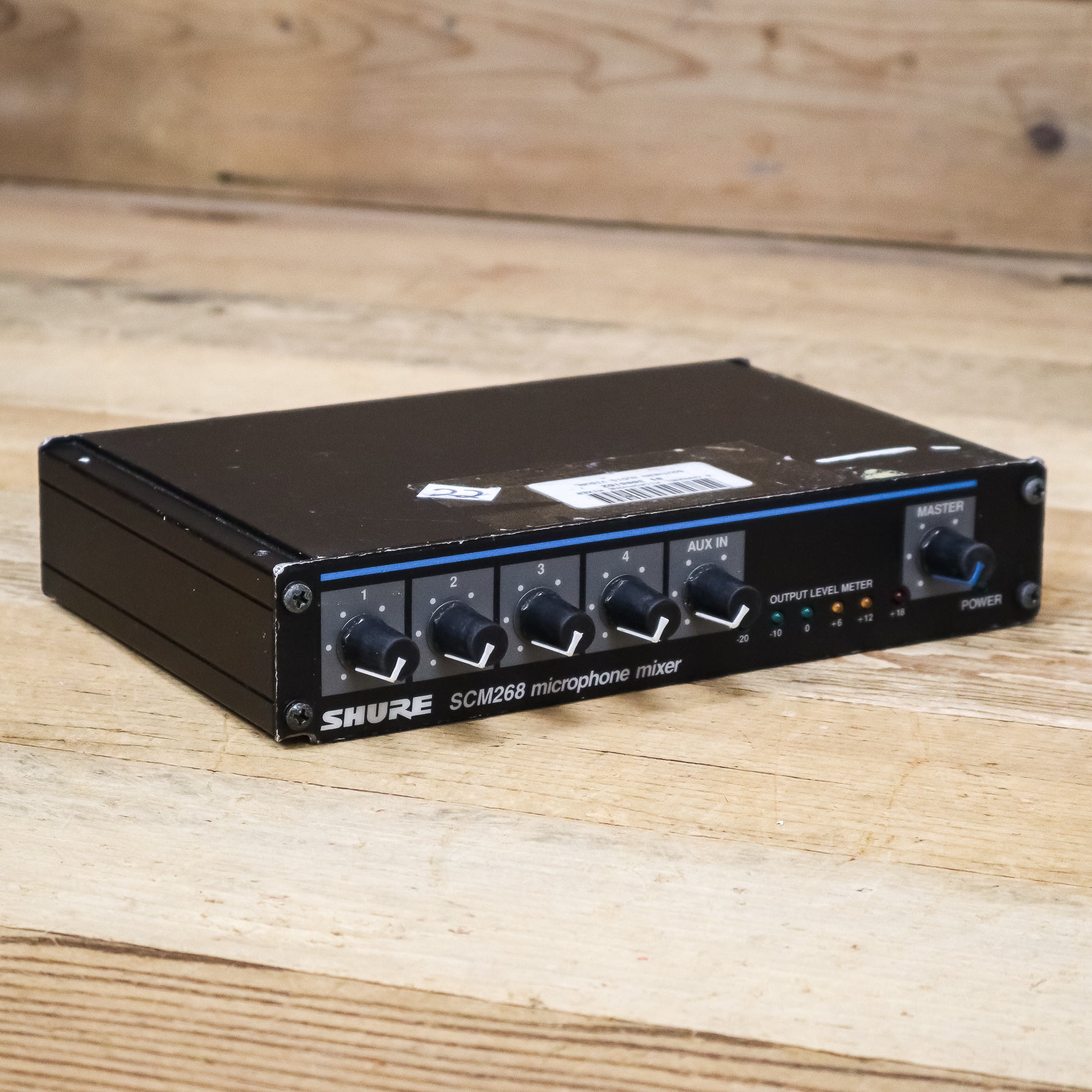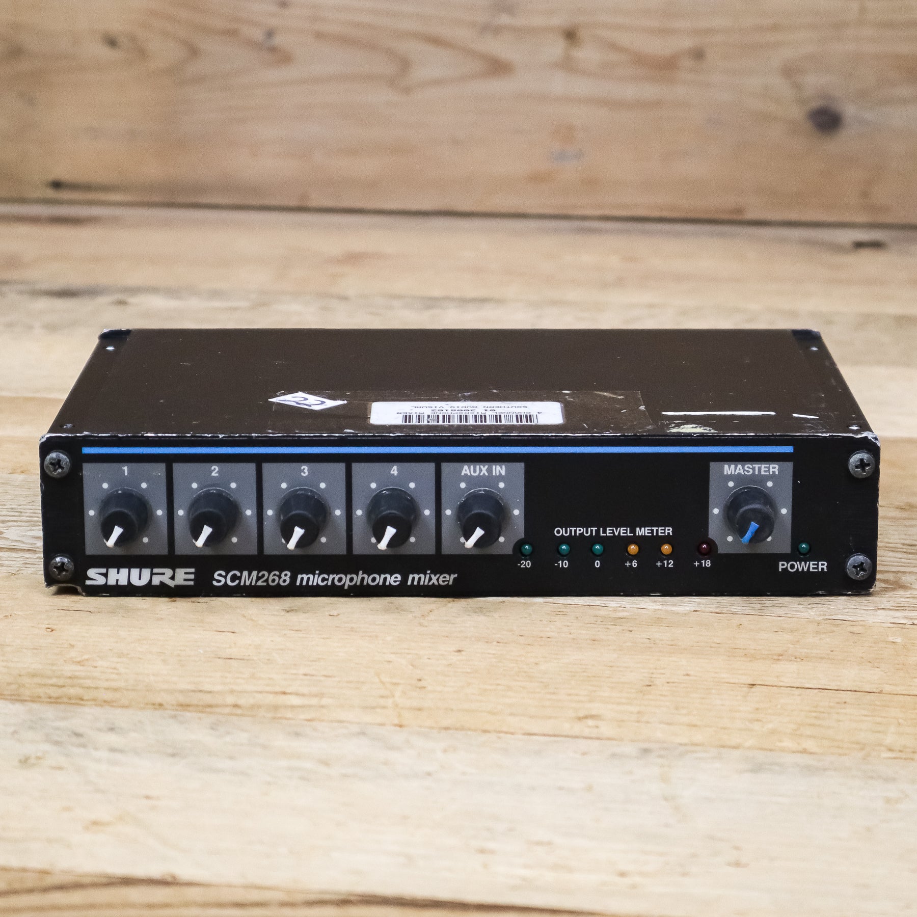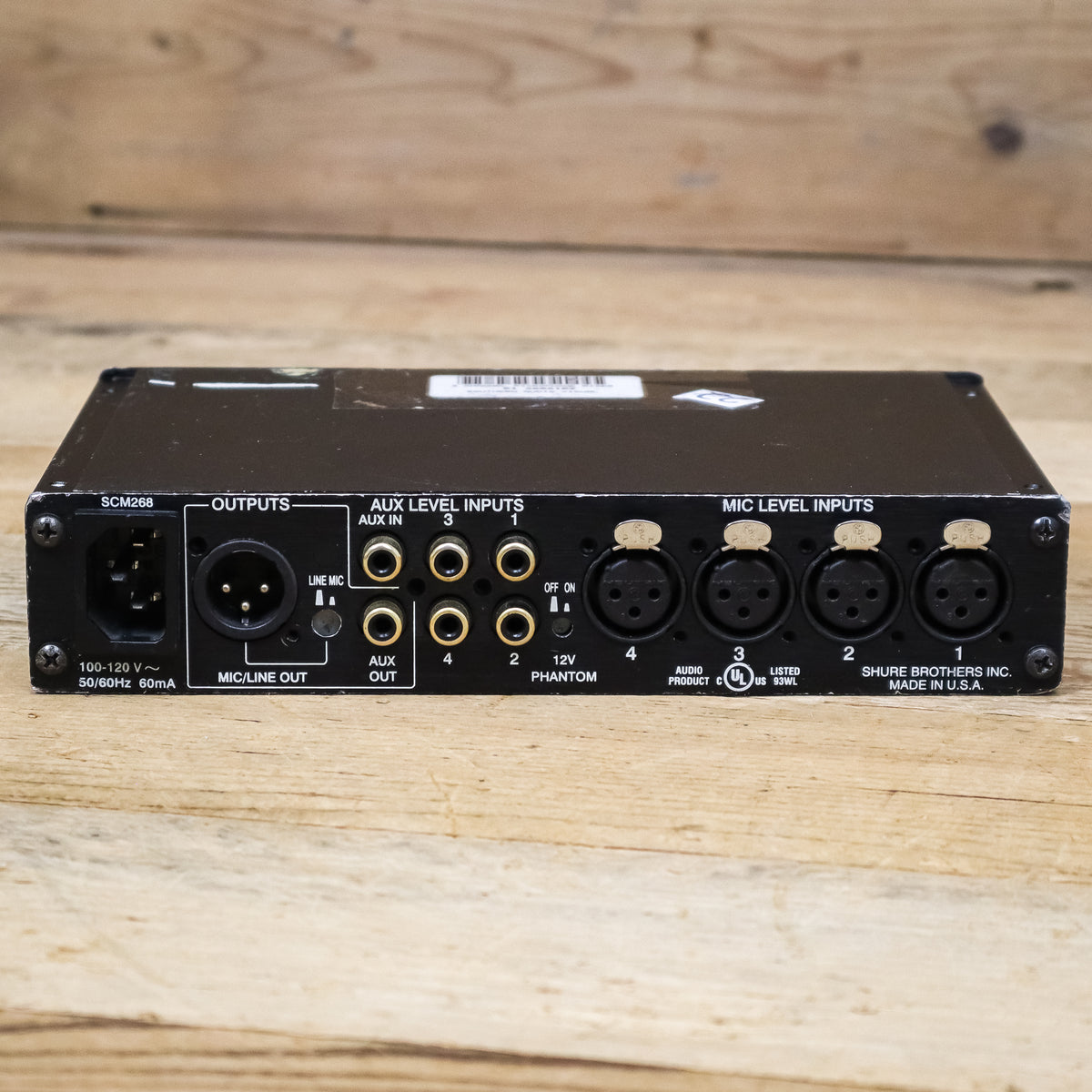 This used Shure SCM268 4-Channel Microphone Mixer comes with a Power Cable.
