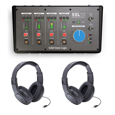 This bundle includes the SSL SSL 12 12-in/8-out USB-C Audio Interface and two (2) sets of Samson SR350 Over-Ear Closed Back Stereo Headphoness.