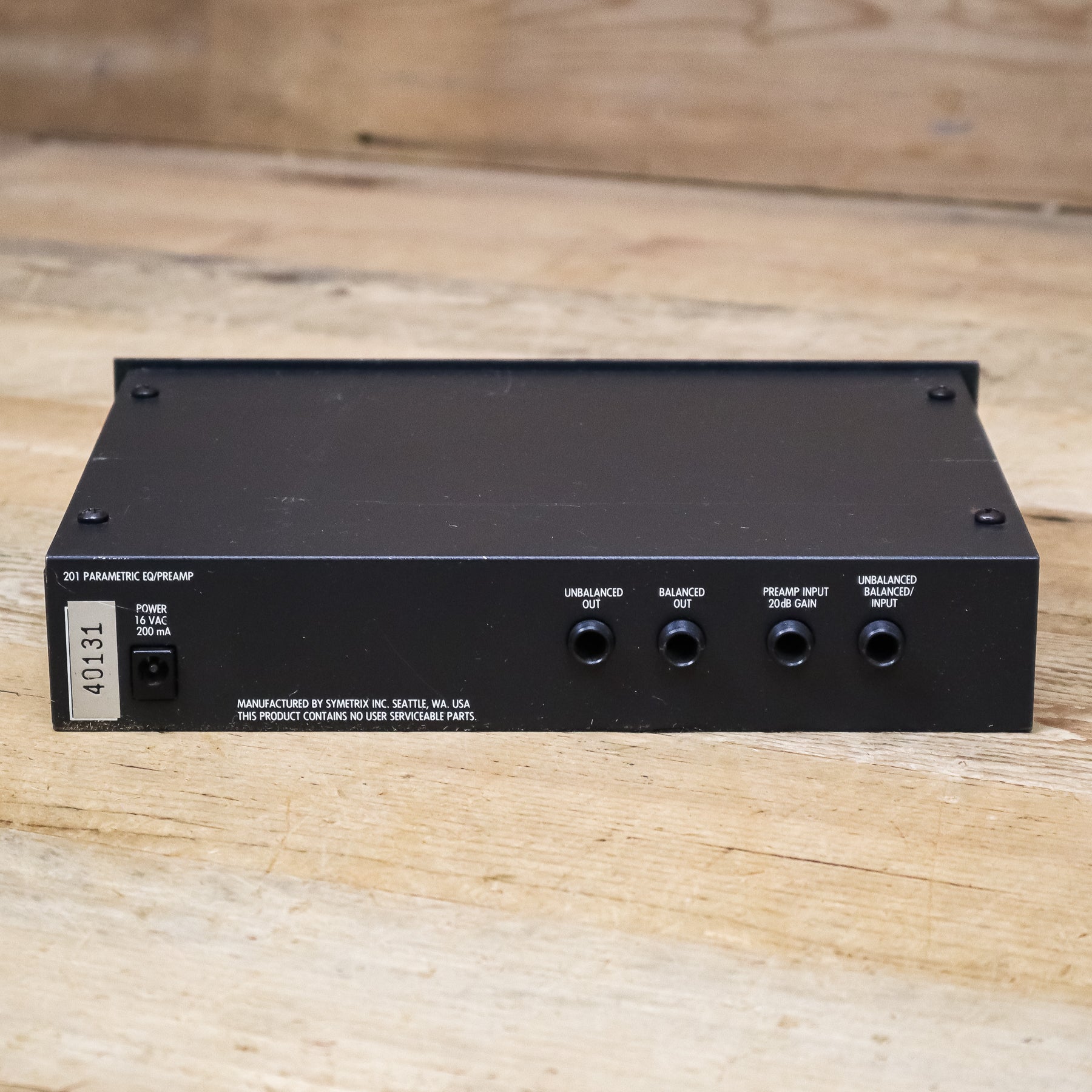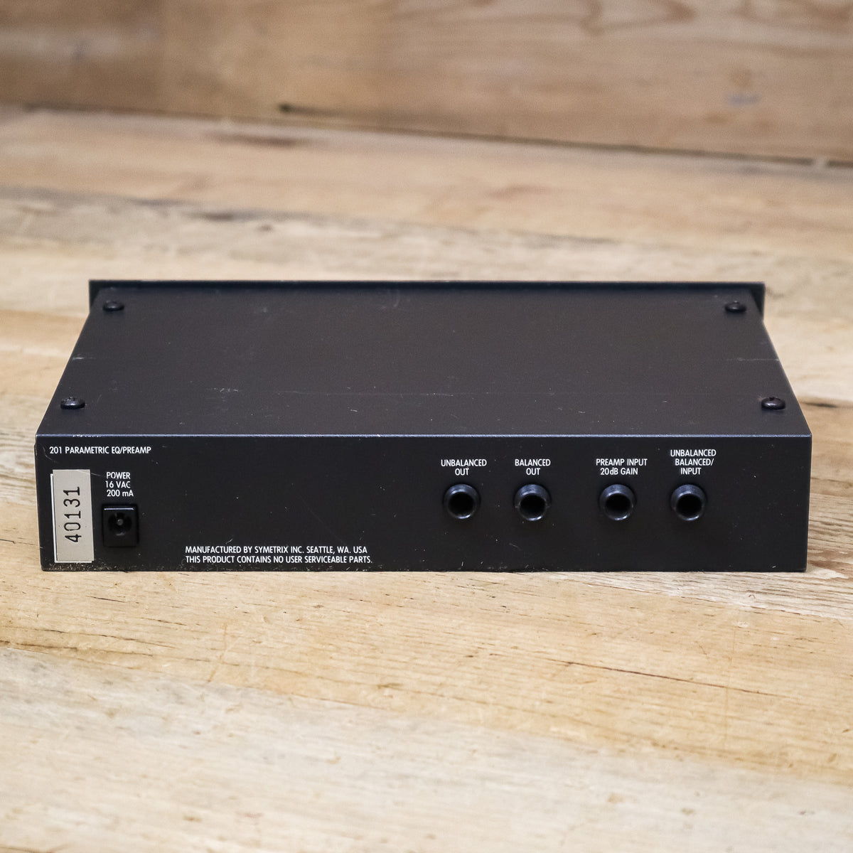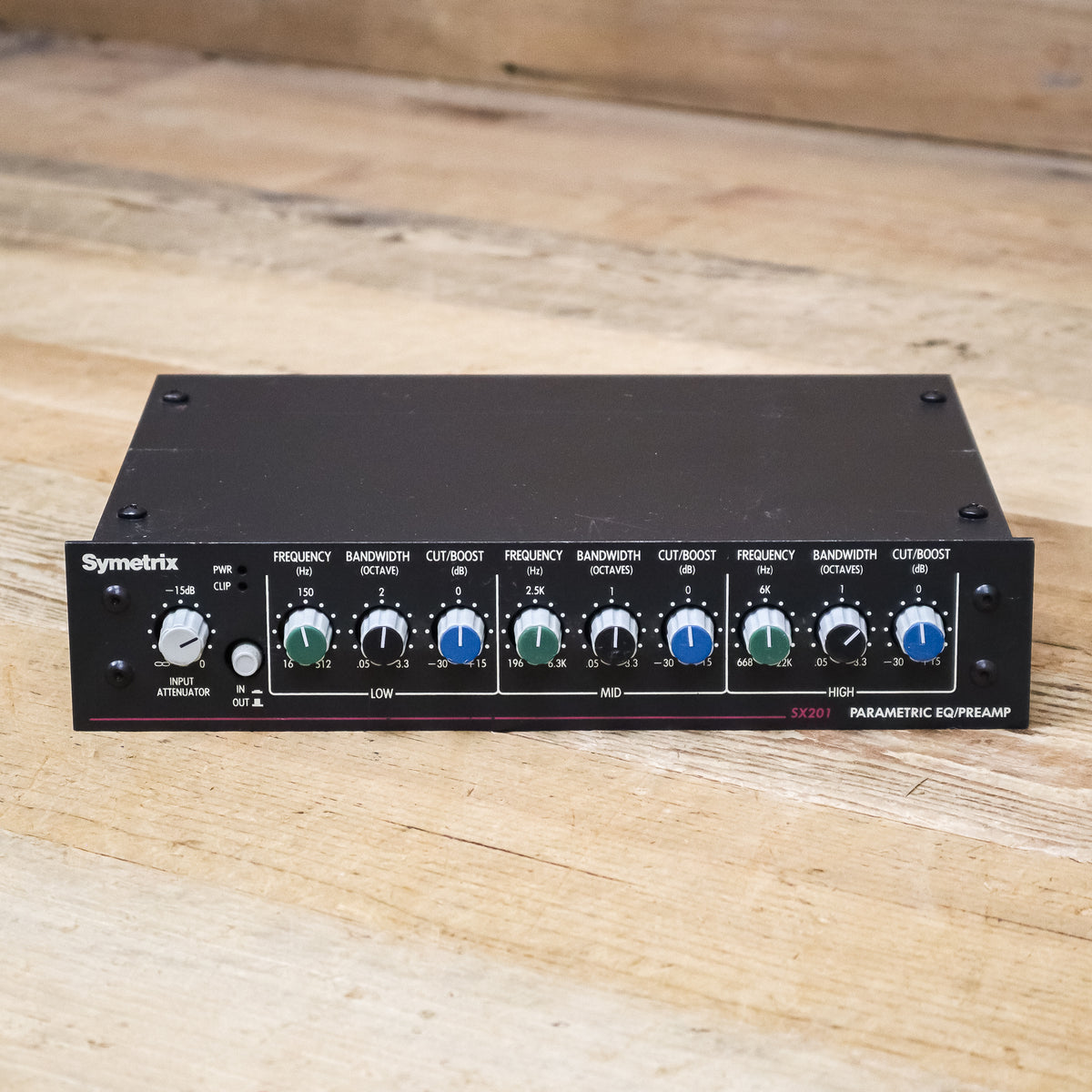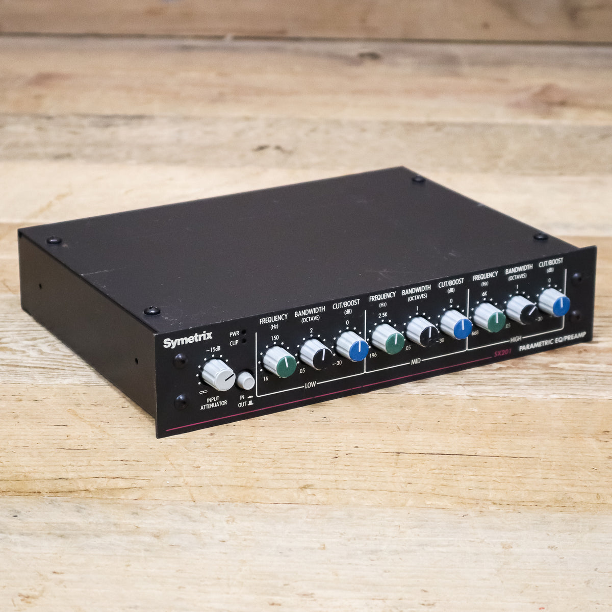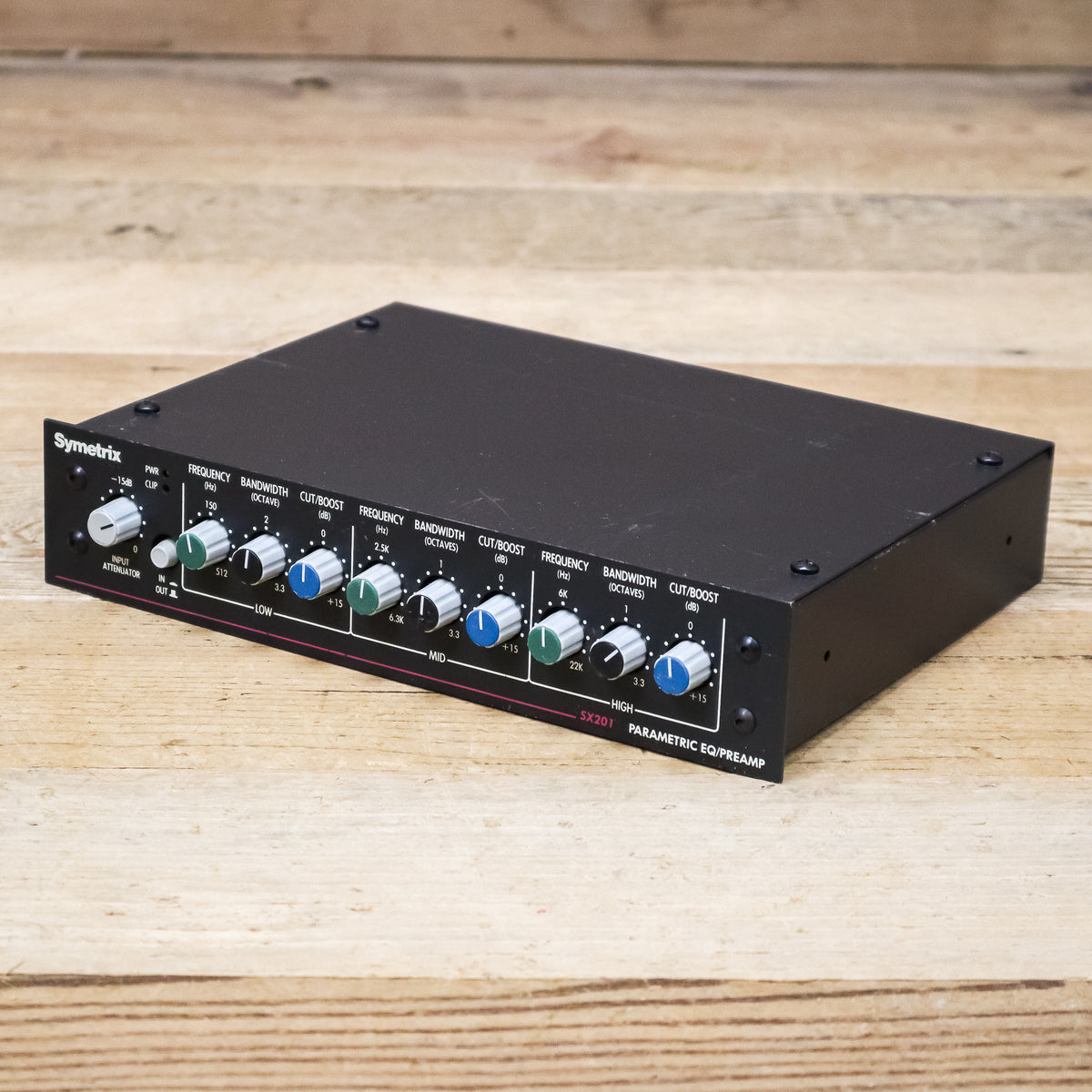 The Symetrix Model 201 EQ/Preamp provides studio quality equalization and notch filtering for line level balanced or unbalanced signals, as well as for low level unbalanced signals. Three fully parametric bands of equalization are provided, with +15dB boost and -30dB cut capability, allowing the SX201 to be used for both creative and corrective equalization. Overlapping frequency controls cover the audio range, from 16Hz to 20kHz. Bandwidth is continuously variable from .05 octaves (for deep notch filtering), to 3.3 octaves (for smooth tone shaping).