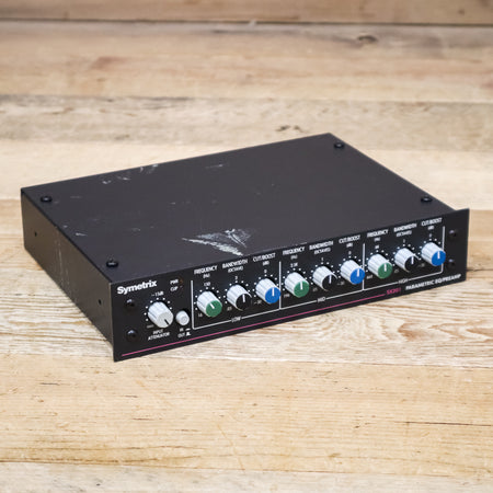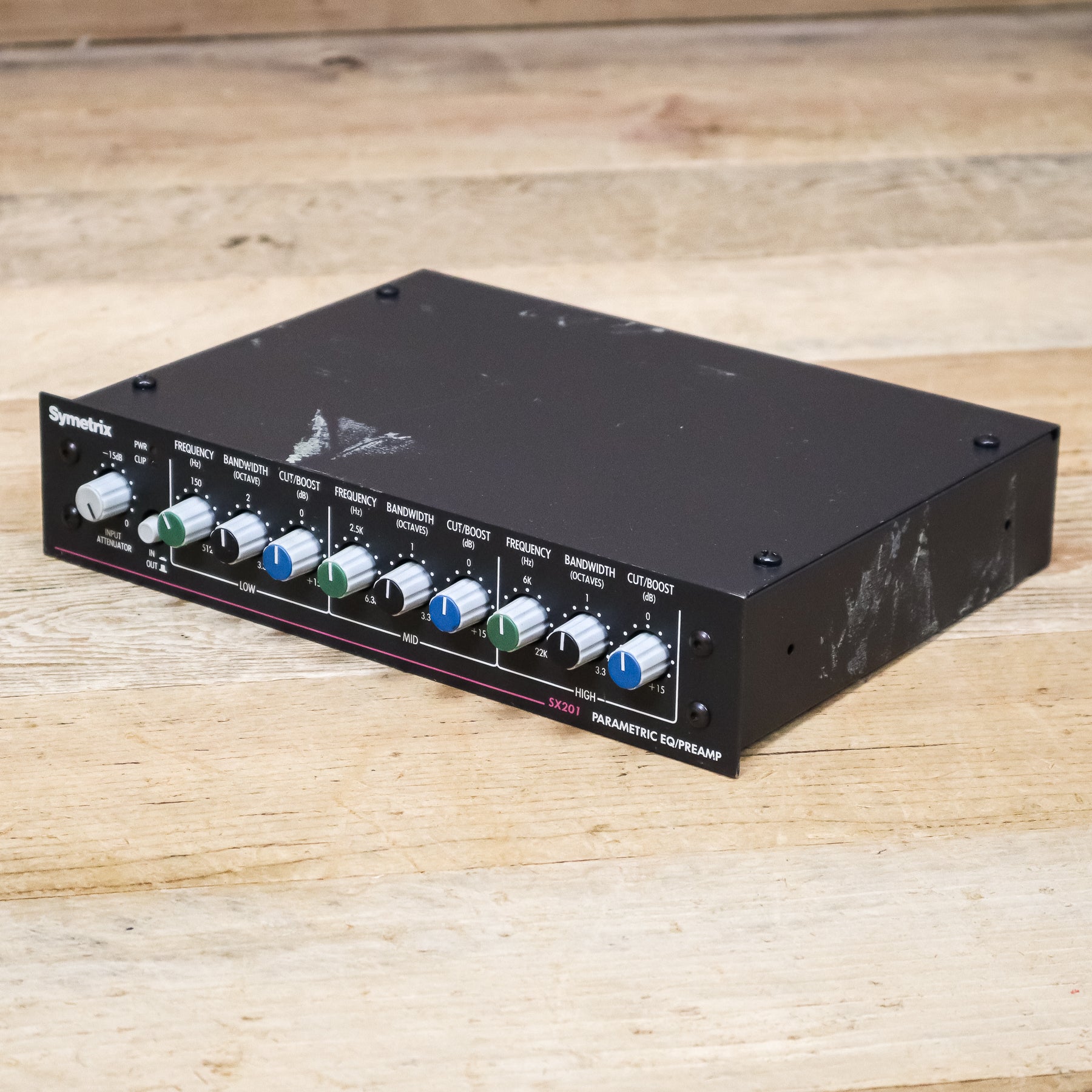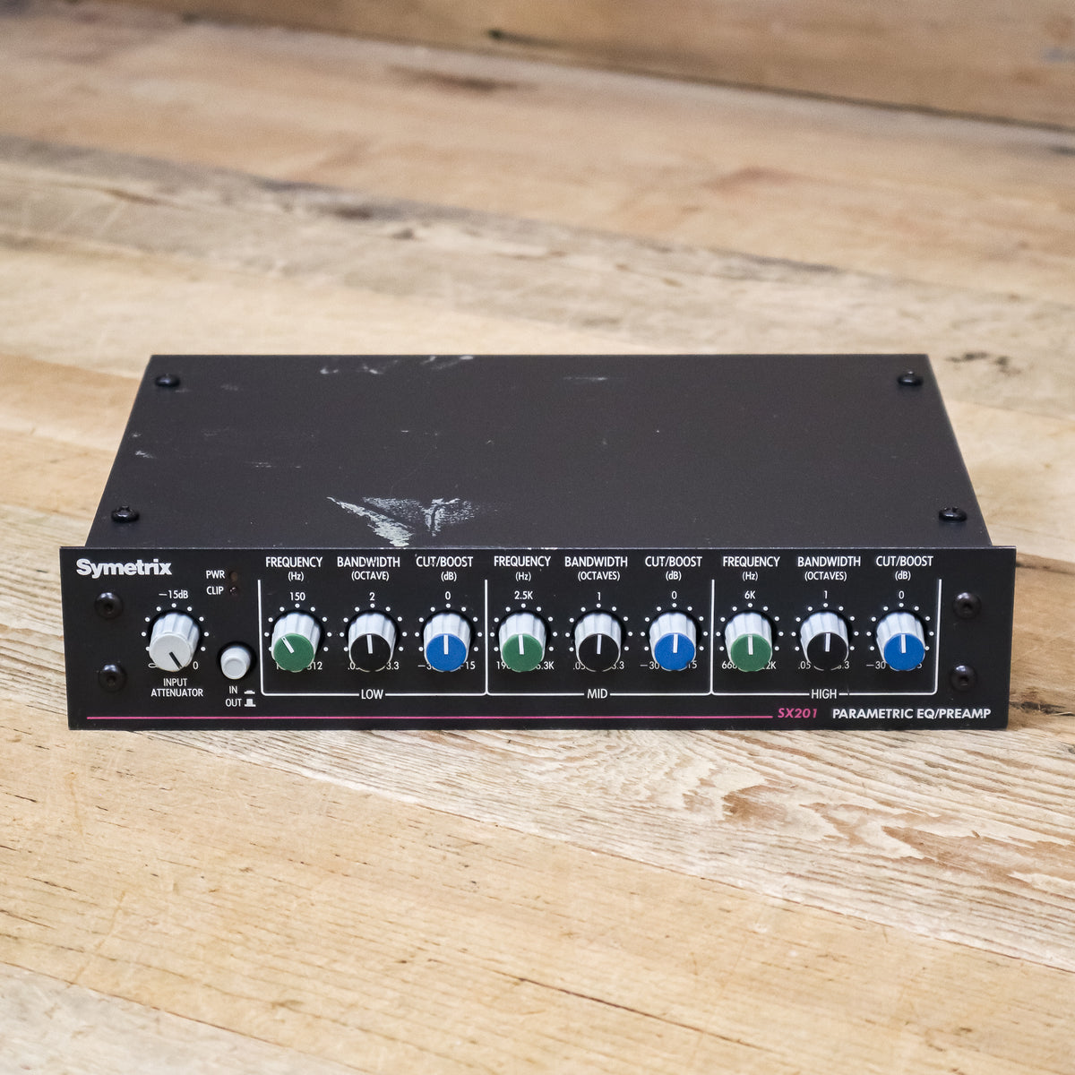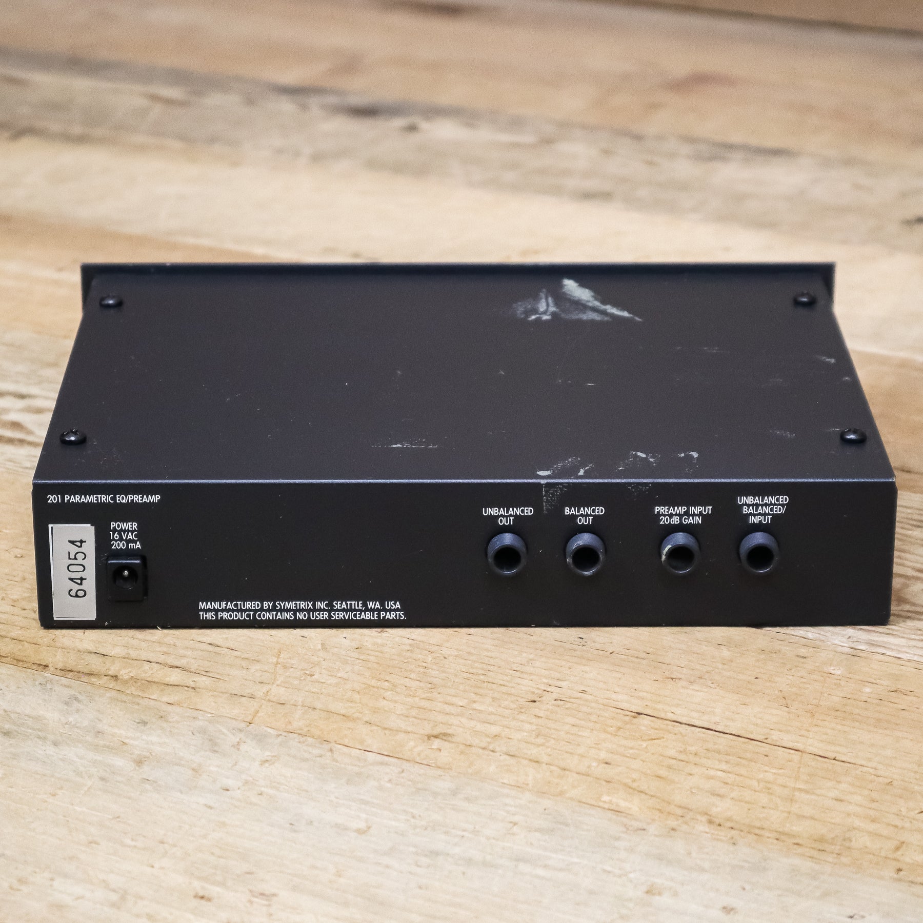 The Symetrix Model 201 EQ/Preamp provides studio quality equalization and notch filtering for line level balanced or unbalanced signals, as well as for low level unbalanced signals. Three fully parametric bands of equalization are provided, with +15dB boost and -30dB cut capability, allowing the SX201 to be used for both creative and corrective equalization. Overlapping frequency controls cover the audio range, from 16Hz to 20kHz. Bandwidth is continuously variable from .05 octaves (for deep notch filtering), to 3.3 octaves (for smooth tone shaping).