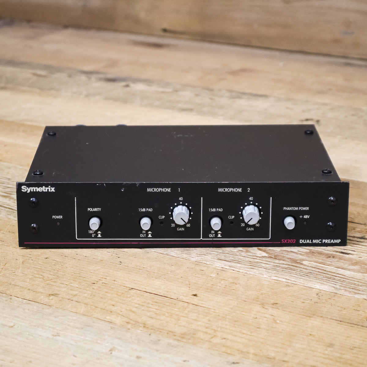Variable gain inputs, with 15dB pads, allow the SX202 to handle any input level up to +14dBV. 48 volt phantom power is available at both inputs. In addition, channel 1 includes a polarity switch, to correct for improperly wired cables or unresolvable mic placement problems.