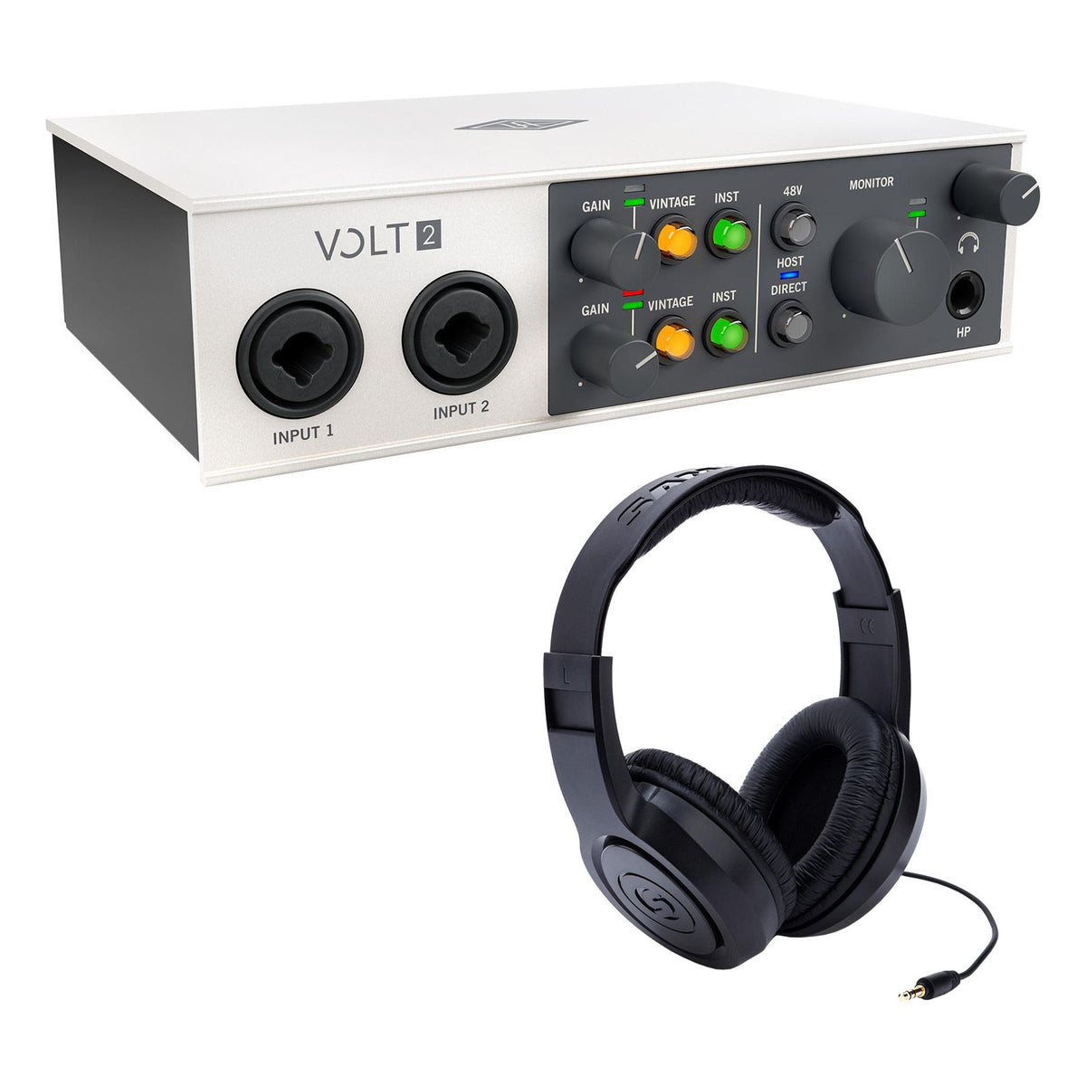 This bundle includes the Universal Audio Volt 2 USB-C Audio Interface and a set of Samson SR350 Over-Ear Closed Back Stereo Headphones.