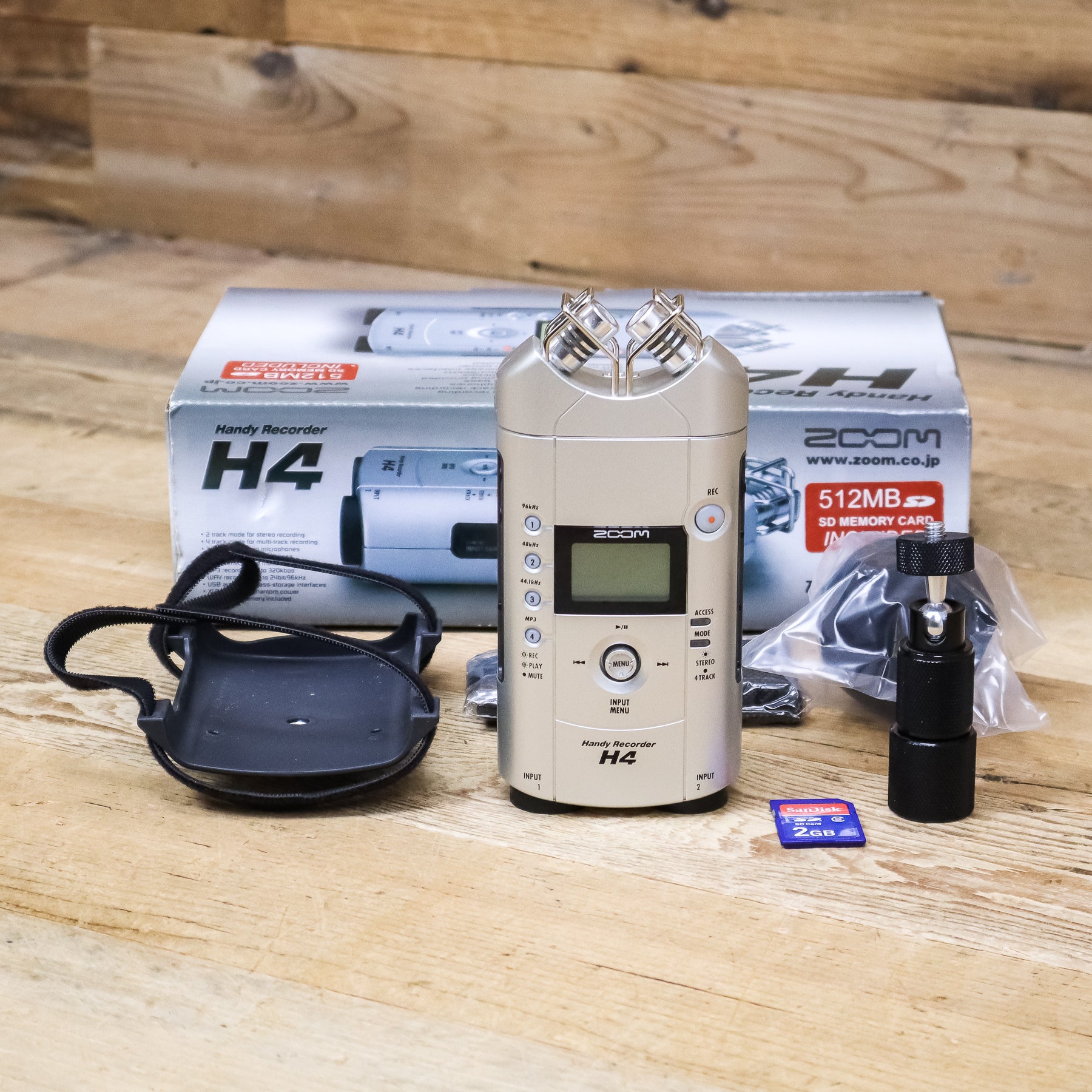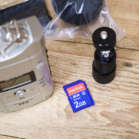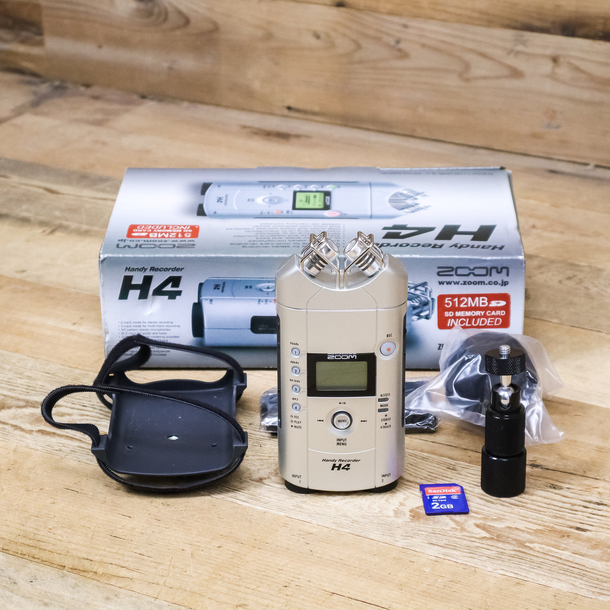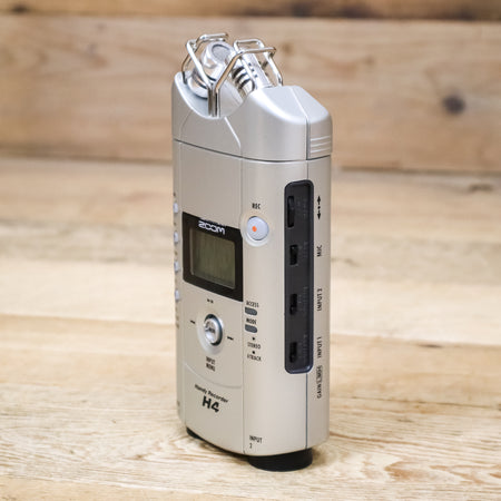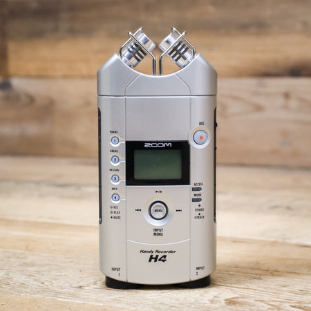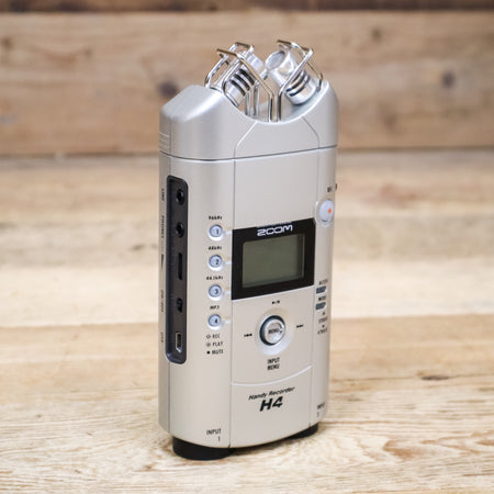This used Zoom H4 Digital Recorder comes with the Original Box, 2GB SD Card, Windscreen, Mounting Plate, Tripod Mount, and a Storage Pouch.
