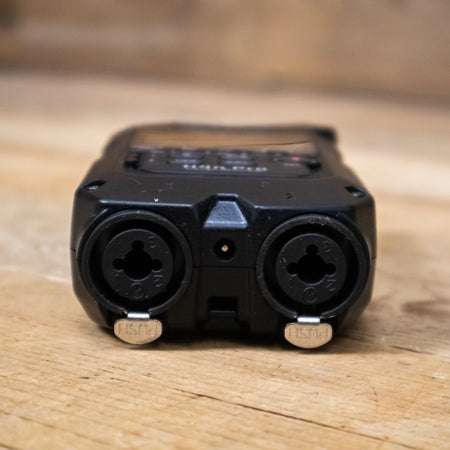 The two locking combo connectors accept either XLR or 1/4" balanced/unbalanced phone cables, handling mic- and line-level signals as well as instrument-level signals. Phantom Power of +24 or +48 volts can be applied to both inputs. Plus, there's a stereo 1/8" Mic jack for external audio sources, including lavalier microphones requiring 2.5 volts of plug-in power.