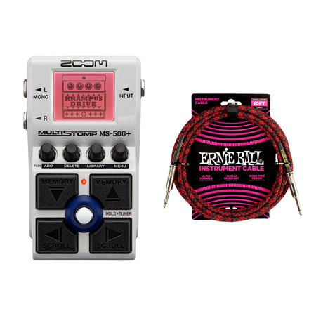 This bundle includes the Zoom MS-50G+ Multistomp Guitar Multi-Effects Pedal and an Ernie Ball P06394 10-foot Red/Black Braided 1/4" TS Instrument Cable.